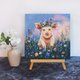 画中可爱的小猪 Frosya 散发着令人难以置信的温暖和喜悦。她站在草地花丛中,仿佛大自然在向她祝贺新的一天的到来。她头上戴着迷人的花环,彰显着她的青春和纯真。温柔的蓝天上飘着粉色的云朵,营造出一种轻松快乐的氛围,让整个空间充满了光明和温暖。