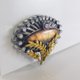饱满的麦穗借着高升的日光,将天空也渲染成金橙色,宣告着丰收时节。纯银别针主体为带着金光紫色长石和艳红色石榴石,麦穗造型部分以24K金箔烧赋(热贴金)技法处理。