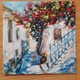 第一幅微型画:一座雄伟的蓝色圆顶教堂——圣托里尼岛的着名地标——点缀着盛开鲜花的巨大花盆。