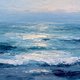 《潋海》收录于“自然诗境系列”,以多层次蓝色厚涂笔触描绘阳光洒落海面的瞬间。细碎浪花在画面前景翻涌,远处海平线渐渐被雾感天光吞没,光带在水面上拉出一道柔和的金色,既宁静又带着力量。粗犷刮刀痕迹让浪尖与水纹充满立体感,仿佛能听见潮声与海风。