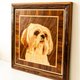 镶板采用镶嵌工艺,带框架尺寸 - 55x55 厘米。作品创作中使用了鸡翅木单板、美国胡桃木、悬铃木枫木、加蓬木、白蜡木、古东木、紫檀木、红木。框架 - 着色松木,刷漆,生锈。作品上覆盖着亚麻仁油和虫胶。车架配有悬吊。作品创作时使用了9种以上的木饰面。该影像由 450 多块单独的单板组成。该面板的制作花费了哥斯拉大师长达30个小时的工作。我们接受根据您的照片制作宠物肖像的订单。可依所需尺寸进行定制化。定制作品可以没有框架。