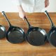 Kaneko's frying pan is characterized by its thinness. A single iron plate is heated to a high temperature and beaten to create a three-dimensional shape while creating edges and height. The handle is also made of the same piece of iron plate, so the handle is not a separate part, it is all integrated. Therefore, it is literally comfortable to use with a sense of unity. It is difficult to make this shape by squeezing it out, but there is strength only in one simple material. Also, because it is made thin, it is not as heavy as it looks.