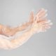 全长约58cm,透明PE材质,从手到手肘确实防护,内侧做压纹加工,可减少因汗水造成手套黏附肌肤情形,阻挡照护作业上可能喷出的液体、脏污或清洗作业,如洗澡、清洗物品时或换尿布等,用完即丢,保护从事人员的清洁卫生。