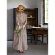 长款连衣裙,上半身的得体金至感与下半身的开阔感,形成嘟有的轻中式气质:可爱、烂漫、优雅、充满生活的朝气。小立领,半开门襟,上半身的开襟结合中式的盘扣,盘扣经过改良,用特别的手法将中式的扣绊做的更加年轻当代,在这里面,可以看到年轻化的视角,也可以看到传统与当代的小碰撞。微落肩线,包容性好的同时,让略有舒缓的肩部拥有利落的状态。