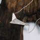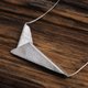 This necklace is handmade from two silver pieces that are crafted from a silver strip that we textured on surface with natural materials (wooden tree bark, straw, dry teak tree leaves, etc). The silver strip was thinned to roughly around 0.5 mm thickness by passing it into a rolling mill together with various materials that left the surface textured with beautiful, deeply embossed, natural patterns. The two pieces of silver strip were cut in different simple geometric forms, smoothed on edges and bent into the final shape.