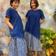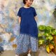 这款短袖洋装采用水洗过的靛蓝色龟壳纹布料,斜裁下摆拼接印度风印花,缀以繁复的花卉图案。
