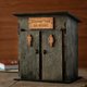 - Wooden piggy bank in the shape of toilet stalls, one door with a man sign, the other with a woman sign, and a small sign with an engraved text. The doors can be opened and are held shut by small padlocks with keys. The text on the sign is custom. This coin bank is made of wood and can be stained in different colors (see description for color variations).