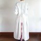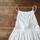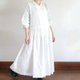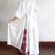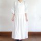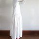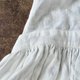 纯白色麻制成的低腰围裙连身裙,带有大量褶皱。
