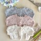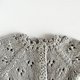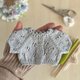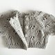这是一件手工编织的娃娃毛衣,颜色柔和细腻,带有蕾丝图案。