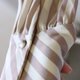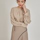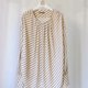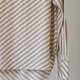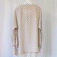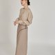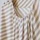 奶茶色斜条纹布料,轻轻柔柔非常舒适的材质。版型上为落肩、圆领,并在领子上做了细褶,让布料产生不同波纹的质感,更富有立体感,肩部的包扣也是设计的小细节,袖口较长,着穿上身可反折,更显得俐落有型。漂亮的布料搭配简单大方的设计,气质美衫。