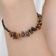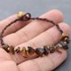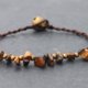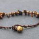 这款手工编织手链采用深棕色蜡线与虎眼石和黄铜珠编织而成。用铜钟封闭