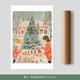 背景的粉色与米色房屋静静伫立,屋顶覆着白雪,窗内透出暖光,像是一个准备好迎接家人与朋友的冬日小镇。柔和的绿灰天空飘落细雪,让整幅作品同时拥有清冷空气感与温暖情感线。