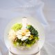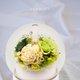 花材选用:日本永生小玫瑰(浅绿/茶绿)、蓪草索拉花玫瑰(白)、永生绣球花(浅绿)、永生百日菊(白)、永生百万星(金)、永生蜡菊(白)、永生小星花(天蓝)、巴西小星花(白)、永生雪绒花(绿/黄)、永生豆铃兰(金)、永生苔藓(白)