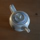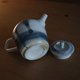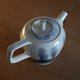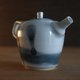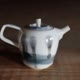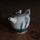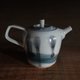 壶身下半部是一整片深蓝绿,像水面或远远的山脉,往上有几道被火拉开的蓝、绿色垂直笔触,像雾气里的树影或山形。壶盖边缘则是一圈淡淡的蓝紫晕染,让整体看起来更柔和。
