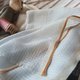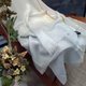 清淡渐变色糸的手工刺绣全绵羊毛围巾 - 花落, 薄透柔软丝滑如羊绒, 全身织有小格暗纹, 配以渐进的淡蓝色及金线织边 , 贵气精致. 我们再手工刺綉了一幅花瓣飘落的图案, 在渐进淡蓝色格子暗纹中若隐若现, 成为一幅如雾如烟的浪漫织物.