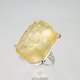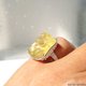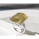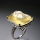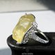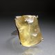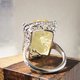 这款戒指以利比亚沙漠玻璃为主体,其内部包裹着放射状的文石结晶,并巧妙地镶嵌在带有唐草与缕空图案的戒台上。