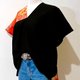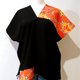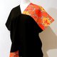这件手作衣是采用日本高级植物染黑色布料为主,橘色与黄色高彩度的古董毛料印花布作跳色的效果。印花上的黑色菱格网纹与黑色布料连成一整体,格纹内的蝴蝶印衬得更加活泼鲜明。