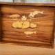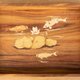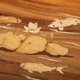 莲池中锦鲤嬉戏游玩,利用枫木与台湾杉木皮表现锦鲤多彩的外表,清雅莲花与荷叶用枫木与白杨木目表来表现。