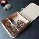 The box has a foldable lid and securely closes with a button on the vegan leather tab.