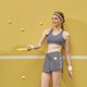 Most popular 2-in-one top is back! This sports bra with detachable cover let you easily change your look from full tank to bra top just by unhooking the outer layer. The cover is light and airy, while the bra is supportive and comes with removable push-up pads. Cross strappy back in checks prints make this piece even more irresistable.