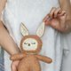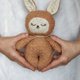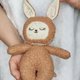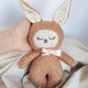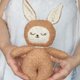 This beautiful banny is completely handmade and a true one of a kind. are custom designed, cut, and sewn, an original in every sense.Most importantly, she is authentic and will do a great job improving the creativity and imagination, two qualities that are so important to have. Material: plush, cotton, embroidery, hypoallergenic fiber filling. Height 26 cm . Boucle fabric and linen. The face and tummy are embroidered by hand Please hand wash /air dry due to wool stuffing. Thank you! For children over 1 year old!!!
