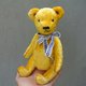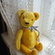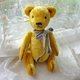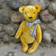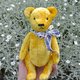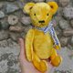 A cute yellow teddy bear with a kind smile is made of vintage plush, stuffed with pine sawdust. The head and paws are movable, jointed with cotter pins. Size: standing height 8,7 inches (22 centimetres), in the sitting position 6,7 inches (17 centimetres). Care: dry cleaning.