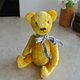 - A cute yellow teddy bear with a kind smile is made of vintage plush, stuffed with pine sawdust. The head and paws are movable, jointed with cotter pins. Size: standing height 8,7 inches (22 centimetres), in the sitting position 6,7 inches (17 centimetres). Care: dry cleaning.