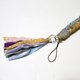 - A neck camera strap woven from hemp string hemp and tear cloth. It has a removable tassel on one side that uses the same color cloth as the wood beads and strap at the point.