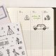 透明贴纸的大小设计成与本日印章的大小相同,因此可以混和搭配使用,而贴纸除了本日印章里出现的小人物之外,我们还设计了许多可以一起搭配的小物件,例如汽车、书桌、街灯、帐棚等等。这些小物件的比例与小人物一样,因此放在一起看起来也很自然,不会有搭配上的不协调。每包为一张透明贴纸,台湾制造。