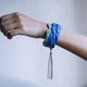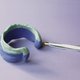 It is a thick bangle with a sculpted pattern like knitting or shedding thread.