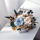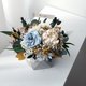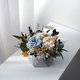 这款桌花使用日本大地农场有机永生不凋玫瑰/不凋绣球,蓝绿色主色玫瑰搭配渐层同系绣球的配色以及跳色的橘黄。复古而温馨的配色配水泥多角盆器体现出温润丰收的气质喔,好好照顾可以观赏3年以上喔~若需做成捧花请来信定制报价喔