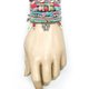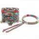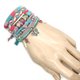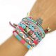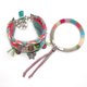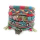 波西米亚春季手链,波西米亚风格珠宝,采用翠绿色、黄色、蓝色、玫瑰色和亮粉鲑鱼色的柔和色调,由两个堆叠的手链组成。一款由天然麻麻纱和彩线制成的钩针管手镯。分层手链由柔软的 T 恤衫、天然波斯玉宝石珠、圆形水晶垫片、压克力水晶、各种银金属元件、管状、端部、链条和钩扣制成。蝴蝶吊饰、硬币吊坠和纤维流苏。