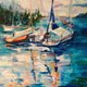 日落时分的海港帆船风景。这幅原创画作以印象派风格用油画创作。您可以看到水面上充满活力的眩光、绿色植物和地平线上的山脉 - 让您的思绪在海风吹拂后自由驰骋。