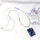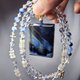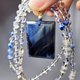 链身设计,高规采珍稀、净体**蓝幽灵(共生珍贵蓝发晶品种)**相佐彩虹拉长石设计,蓝幽灵净透、水润,闪现细腻蓝光、蓝雪花感(若雪景)、甚至共生罕见蓝发晶,彩虹拉长石温润、充满灵性彩虹光光晕,优雅别致,衬托大体材主坠,相得益彰。