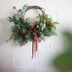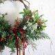 以雪松、丝柏、银合欢为基底,搭配巴西胡椒木、山归来等绯红果实,制作月牙型圣诞花圈,散发着淡淡的松柏香气,再以红丝绒缎带点缀,是今年最质感耐看的花圈之一。