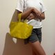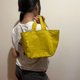 甘单芥末黄素色提袋,开口侧四合扣解开,为一般经典款托特包,若扣上钮扣,则成梯形手拿袋。里袋使用原色胚布,简约环保,侧身、袋底宽度够,放上水瓶、笔记本、笔袋、钱包不是问题,还有口袋可收纳钥匙、悠游卡和手机,也适合作为便当袋。