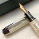 大鹏湾(DAPENG BAY):3952老山羊-以台湾知名特色景点命名,大器书写特别款。采用汉白玉般晶莹剔透的天然珍珠母贝壳,切割成一片一片再组合拼接,尽其可能接续每片的纹路。贝壳片都有天然的纹路及其天然的色彩,人工抛光后包覆在铜管上,再上一层厚厚的透明漆,可看得出接线但摸不到接线。天然纹路,美不胜收,引人入胜 (自然纹路,优质随机出货)。笔款搭配原黄铜车制配件再以灰铬电镀色,旋转式气密笔盖及特制弹性机构笔夹设计。