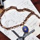 项链坠以碧空般动人的蓝色珐琅为主体,搭配花草纹饰的24K金箔与白色珐琅珠构筑出的花朵。细看花朵旁还加入了翠绿色珐琅珠点缀,与花蕊的红色珐琅珠相得益彰。