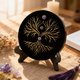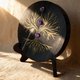 以黑曜石制成的圆形能量摆件,表面经激光雕刻出树状纹路,再一笔一笔手工描上金色线条,最后黏上圆润的紫水晶珠点缀。