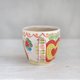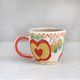 This is a mug with a red apple (with a yellow inside) that looks like an anthropomorphic face, humorous butterflies, and flower lover on top of the unglazed ceramic with a matte white glaze.