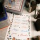 日日年年,在桌子前写字、画图、拼拼贴贴,