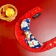 **〈主子卖萌-萌宠招财系列-双面领巾(招财犬)〉**选用__篮底可爱招财犬图腾__搭配__石榴红带金色青海波厚棉布__,缀以精致招财猫造型铃铛,鲜艳而喜气的撞色搭配,让毛孩福气满满、欢喜迎接崭新的一年。
