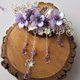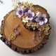 主要材料:天然贝壳片(染紫)、铜质花片(镀银色、原铜色)、白K色铁质弹簧夹、半宝石(天然紫水晶、紫玉髓、捷克珠等)。