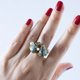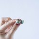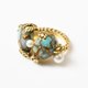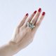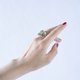 此戒指选用了铜与亚马逊石压缩而成的铜亚马逊石(Copper Amazonite)作为主体。