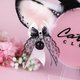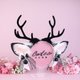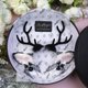 白色和灰色的鹿耳朵,大约 3.5 英寸高,由奢华的人造毛皮制成,镶有施华洛世奇水晶,饰有喷枪雀斑、带绒毛的平绒深灰色鹿角和可拆卸的带铃铛的蕾丝蝴蝶结。耳朵完全有线,并且可以在金属头带上摆动。