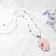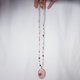 链身以灵性蓝月光石、贵气粉碧玺交织设计为细链身,衬托大粉蛋白坠。宝石水光透润,闪现蓝光、彩虹光、猫眼效应,不对称色彩显灵动优雅。