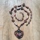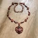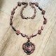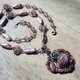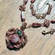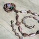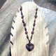 珊瑚玛瑙与绿发晶项链。项链配珠为紫玉髓圆珠与巴洛克珍珠(长形)。线材为纯铜线仿旧处理,扣头为黄铜。项链整体长度为53cm。中央主吊坠尺寸(宽x高)为35x47mm。