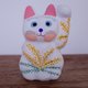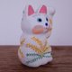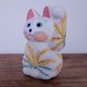 It is a cute handmade beckoning cat. The left hand invites people such as friends and customers.