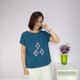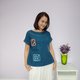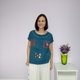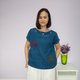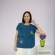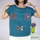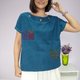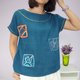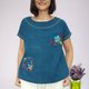 靛蓝色船领短袖衬衫,正面饰有独特的手工刺绣拼接。彩色线刺绣设计的细节很漂亮,海军蓝色衬衫上有出色的彩色拼布作品。