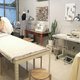有两张大桌子,工业用缝纫机,家庭用缝纫机,熨斗,人台可使用